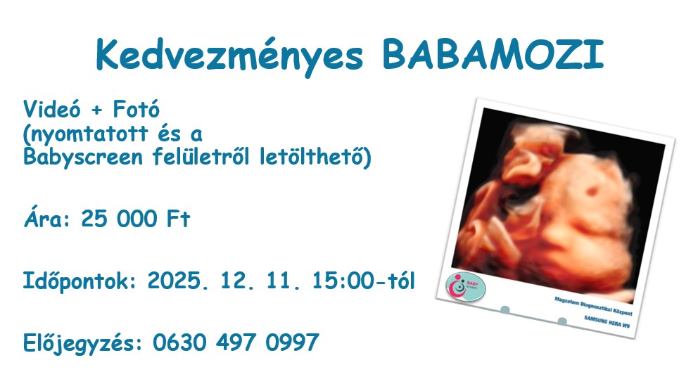 – a teljes vizsgálat (2D és 4D) videófelvétele és a készített pillanatképek a Babyscreen babamozi – (Részletekről tájékoztatót kap) |